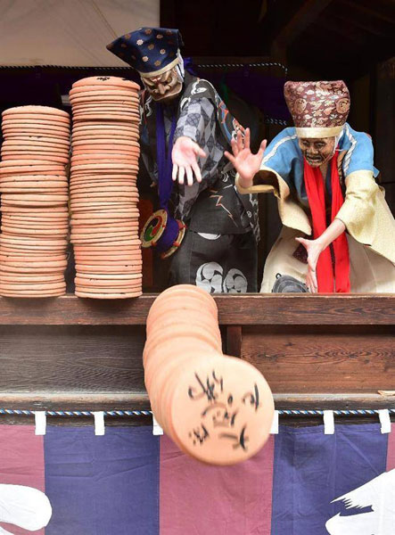 奉納された1000枚以上の炮烙は、節分の夜のメイン・イベントともいえる壬生狂言のオープニングの演目「炮烙割(ほうらくわり)」で、舞台から一挙に投げおろされて木っ端微塵に割られてしまいます。