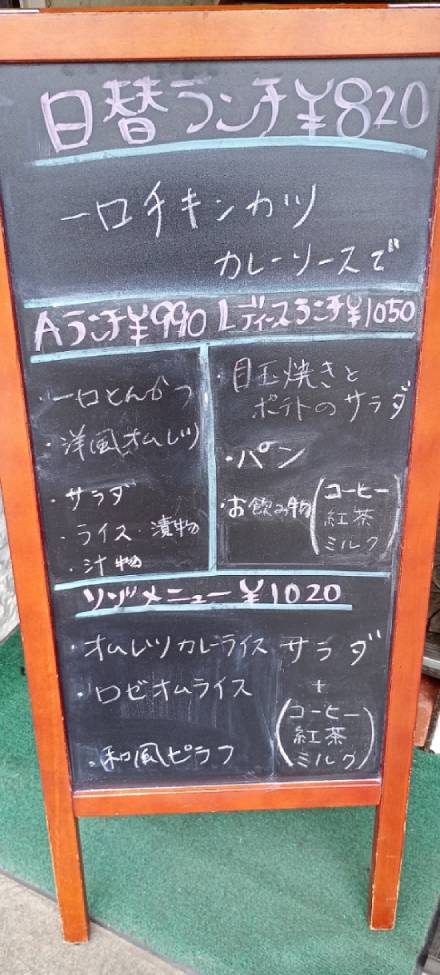 日替わりランチ(一口チキンカツ、カレーソースで)880円。Aランチ(一口とんかつ、洋風オムレツ、サラダとライス、漬物と汁物)990円など。
